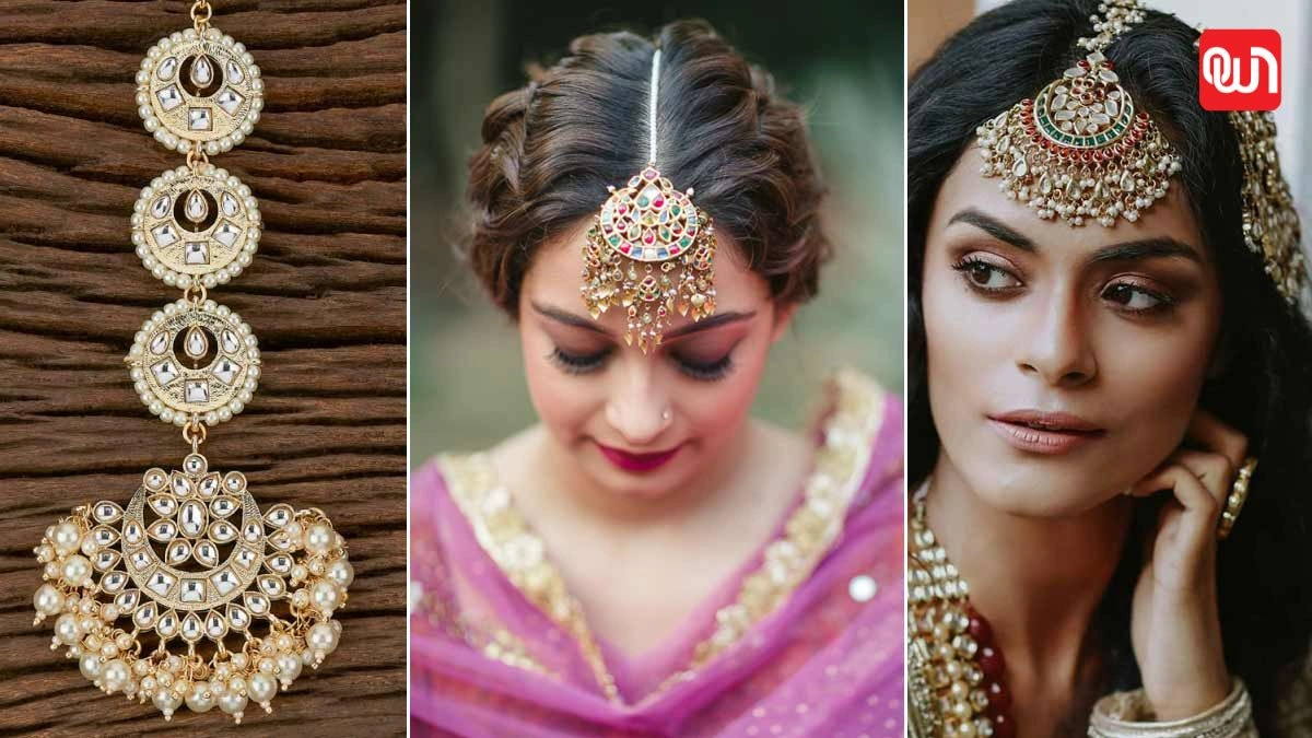 कुंदन मांग टीका: पारंपरिक और क्लासिक डिज़ाइन, साड़ी या लहंगे के साथ परफेक्ट।